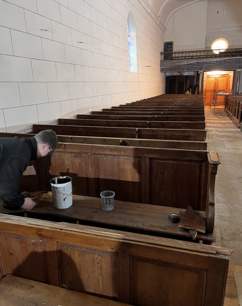Il reste maintenant le plancher à poser, les bancs à replacer, terminer la chapelle nord « de la Vierge »