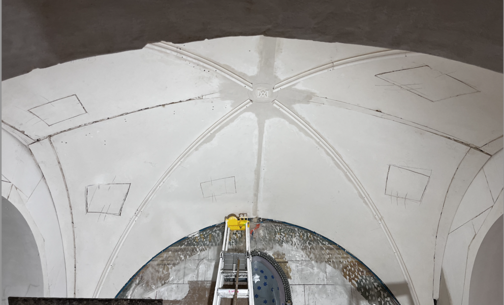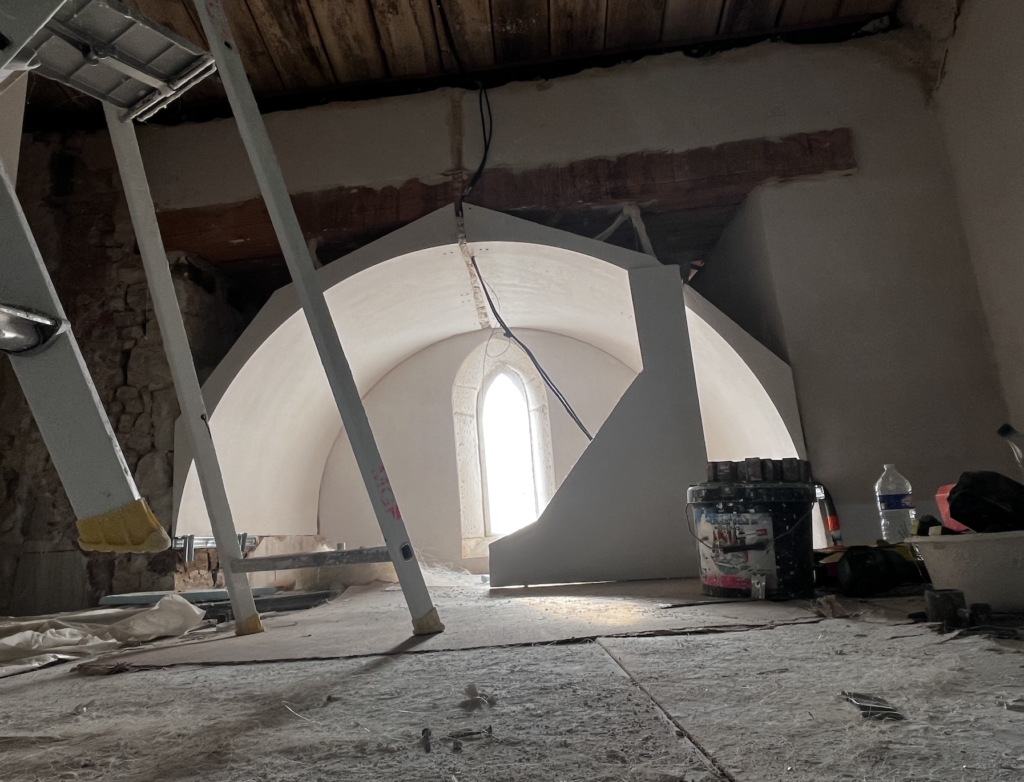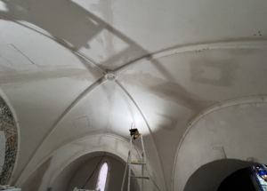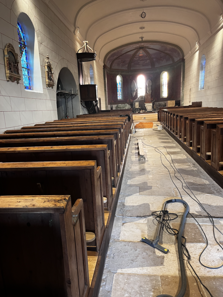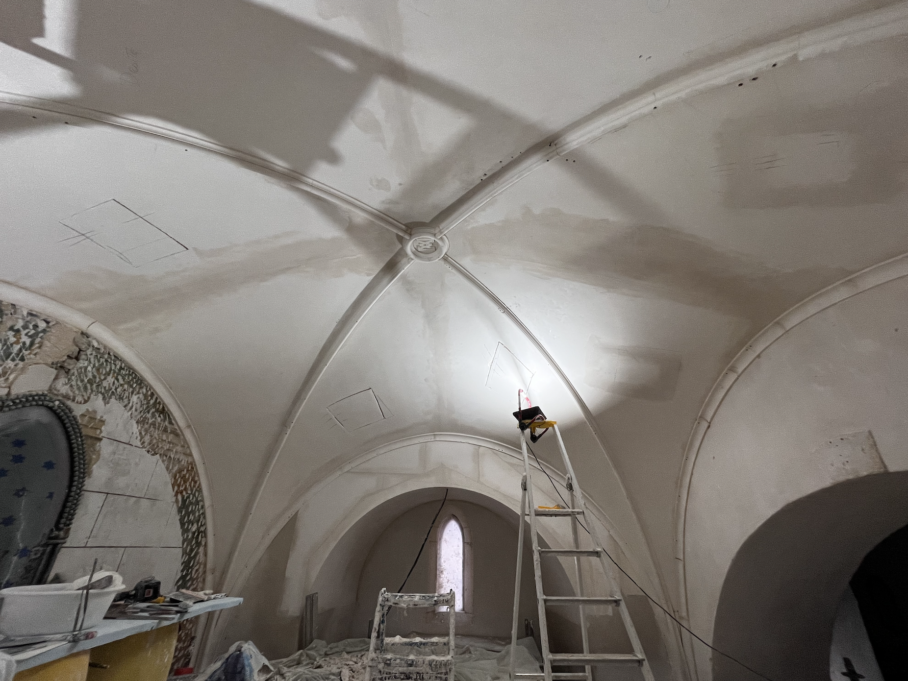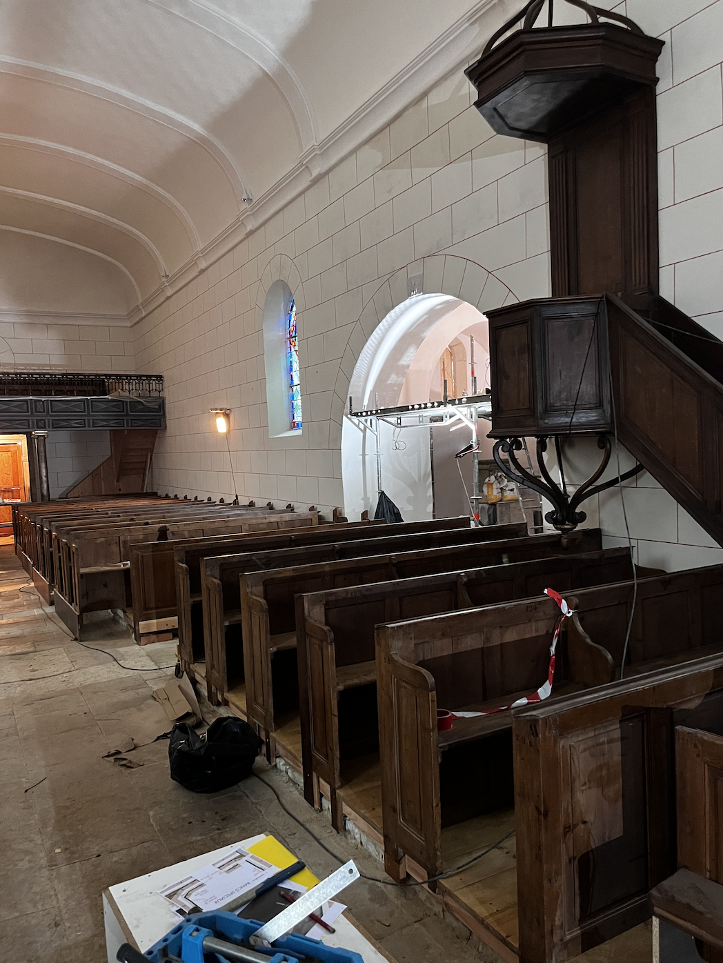 Les travaux ont été entrepris à l’automne 2023 avec la pose des échafaudages intérieurs et reconstruction de la voute plâtrée.