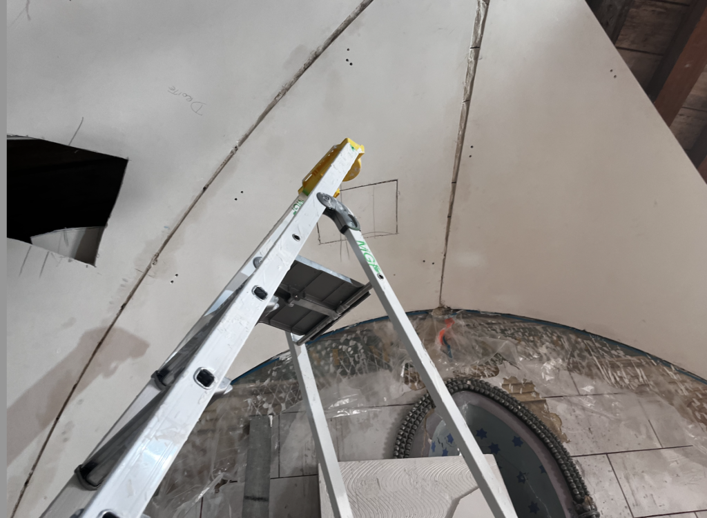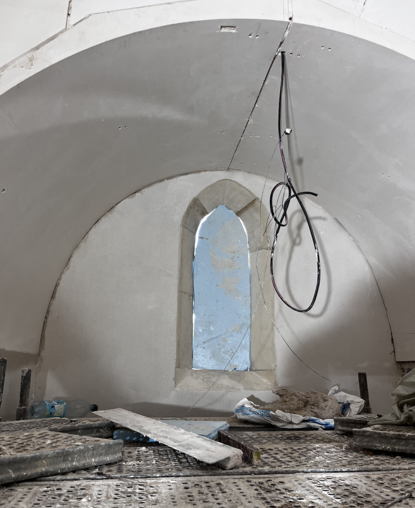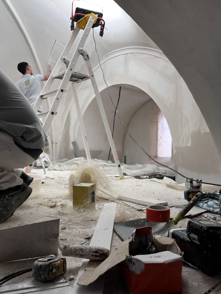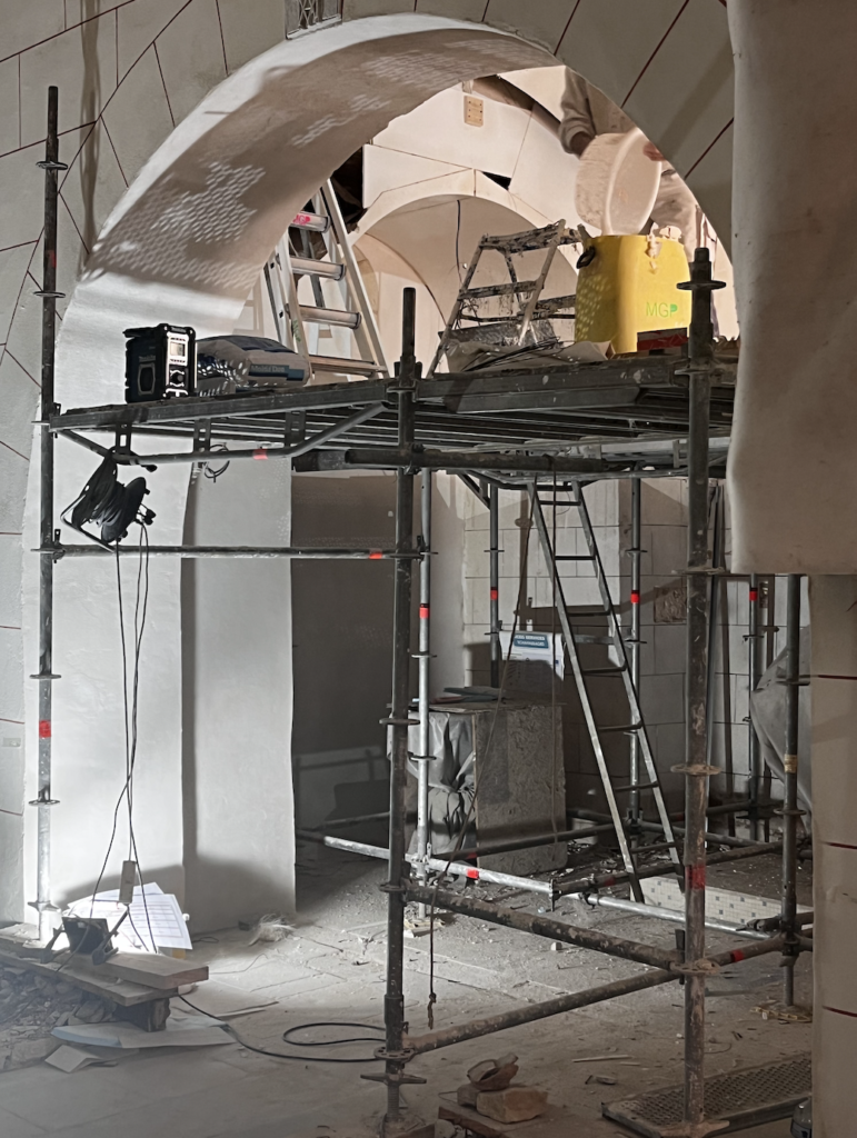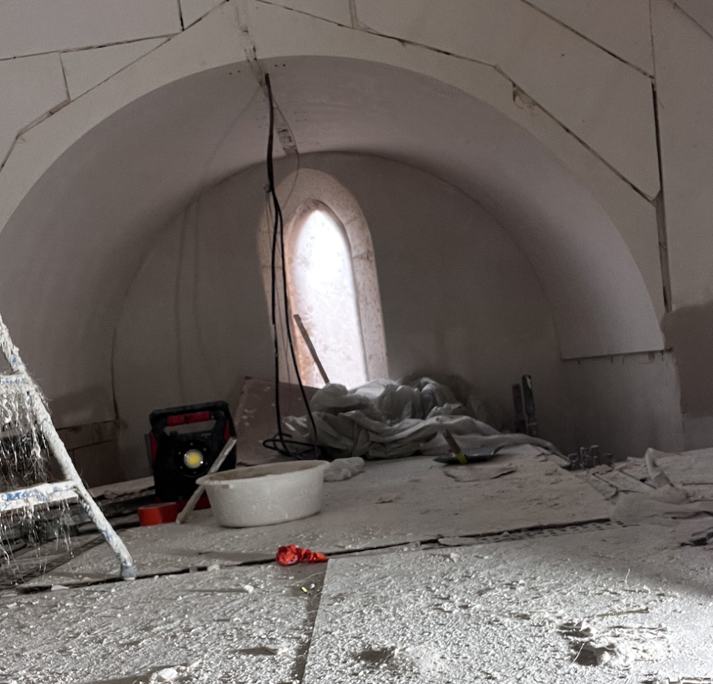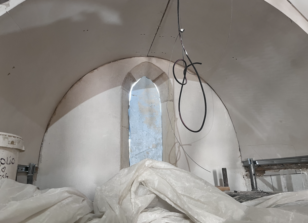 Les travaux ont été entrepris à l’automne 2023 avec la pose des échafaudages intérieurs et reconstruction de la voute plâtrée.