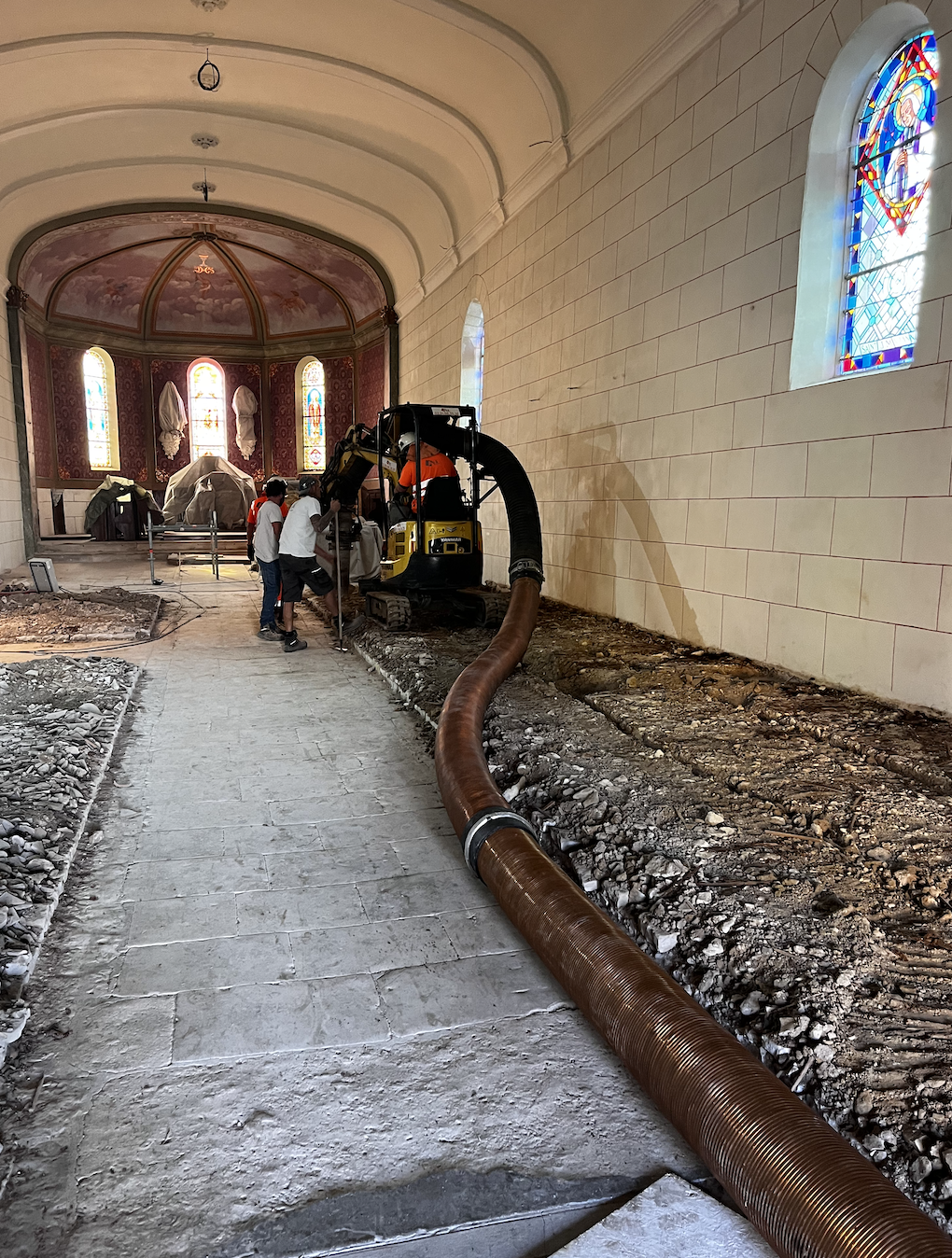 Sous le plancher des bancs, des gravats qu’il faut évacuer par aspiration pour éviter l’empoussièrement.