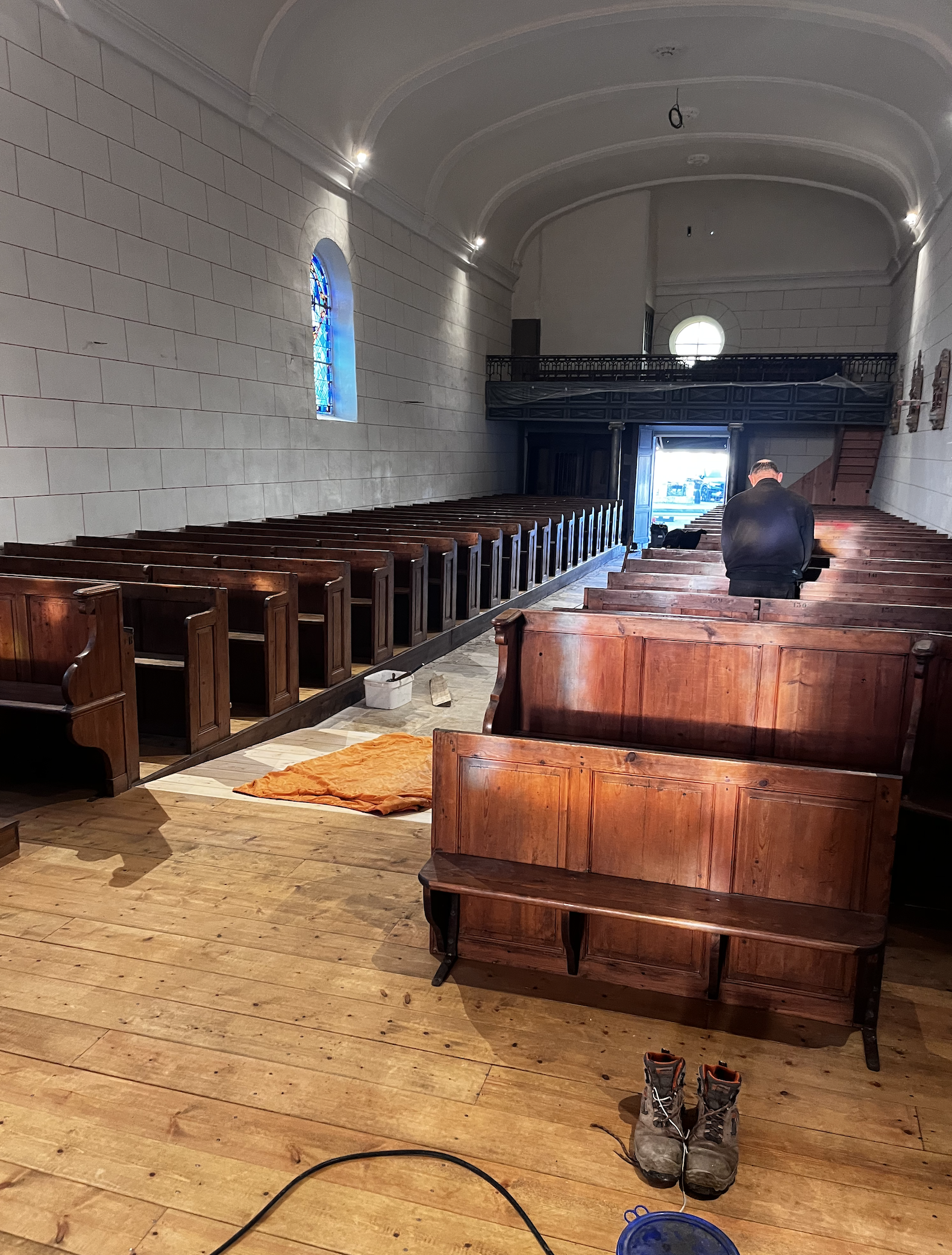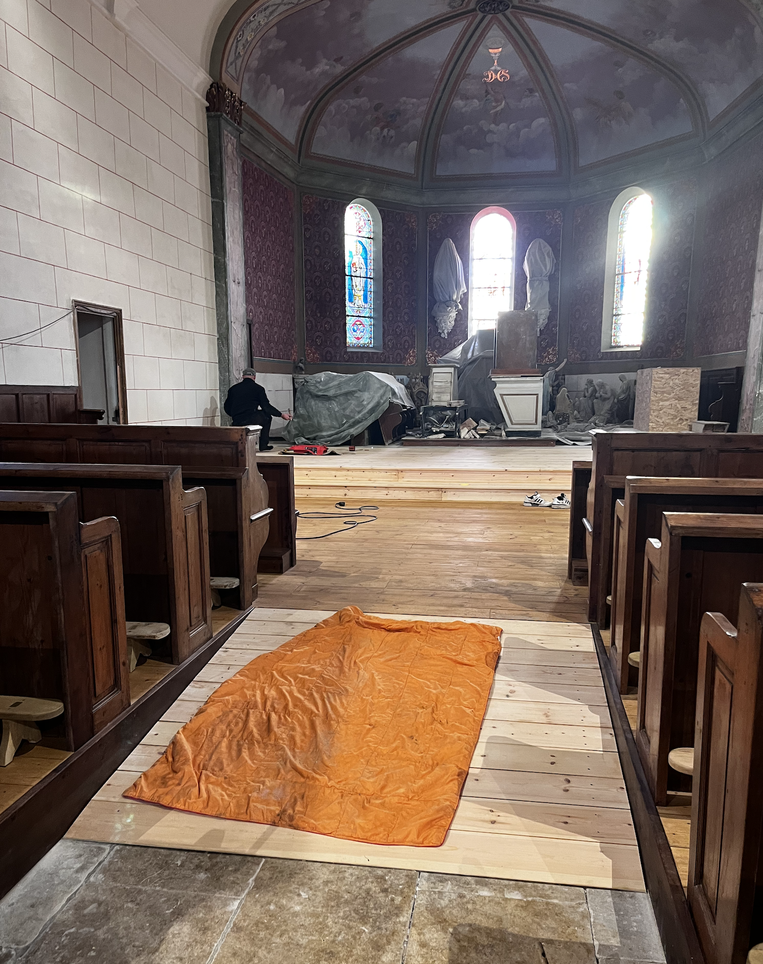 Les bancs sont posés, fixés et cirés. Devant l’autel l’estrade est installée.